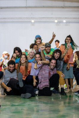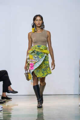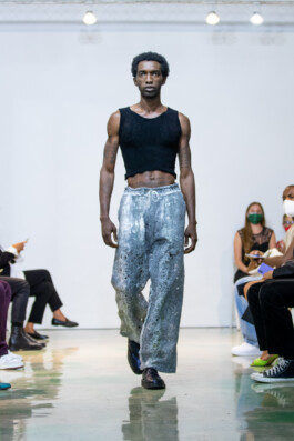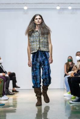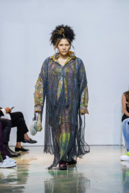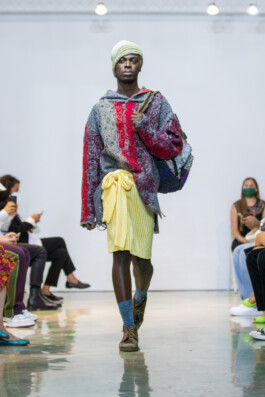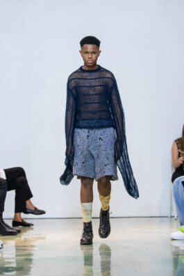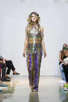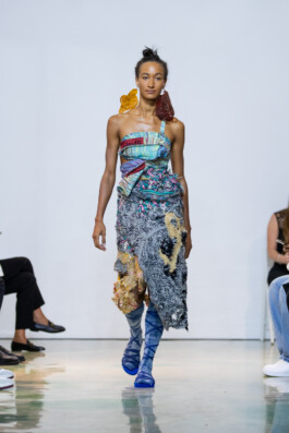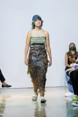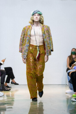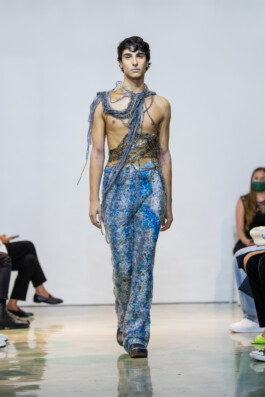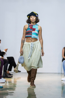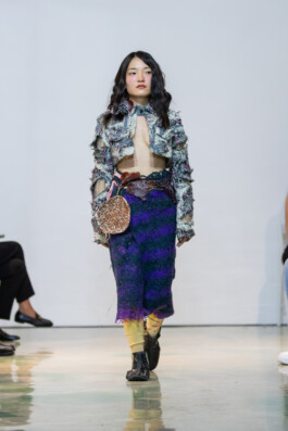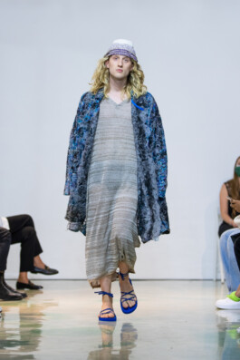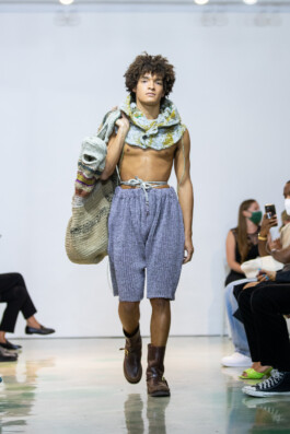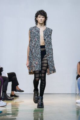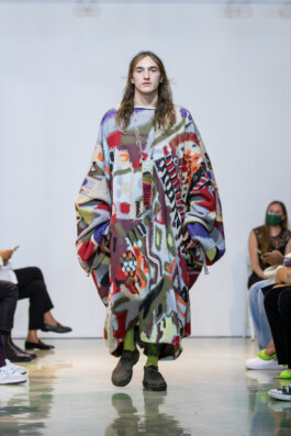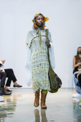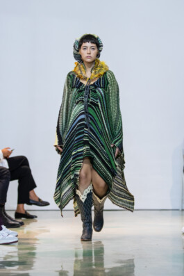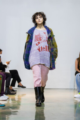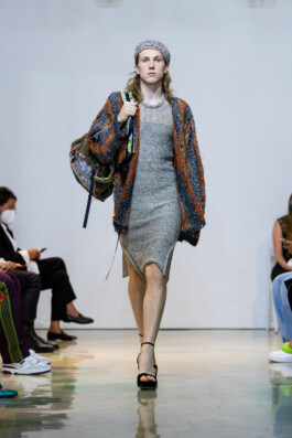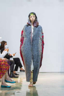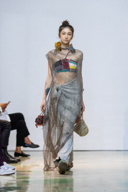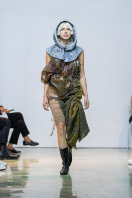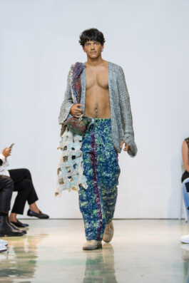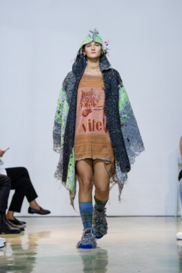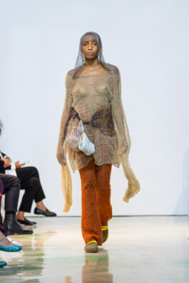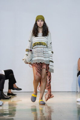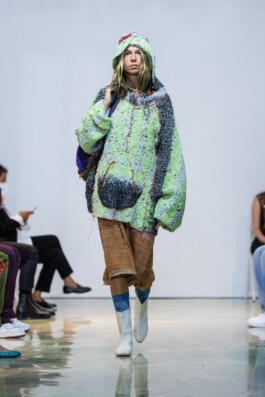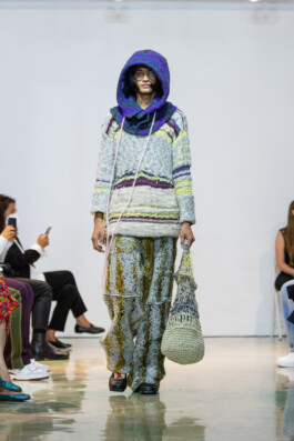 The Organic Knitting Theater (OKT) worked again with a base of harvested “end-of-cone” yarns, knitted with domestic machines onto oversize t-shirts and kaftan-like vests, tight tops and ribbed pijama pants, distorted tops and intricate stitch sweaters. The crochet accessories section was entirely made by hand using the “Tunisian lock” and inspired by Cappadocia, with its ingenious cave housing.